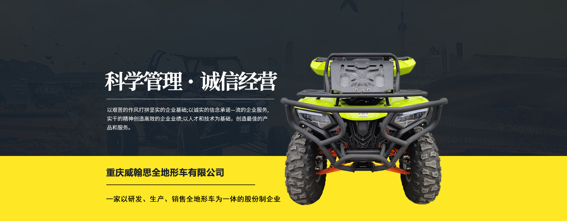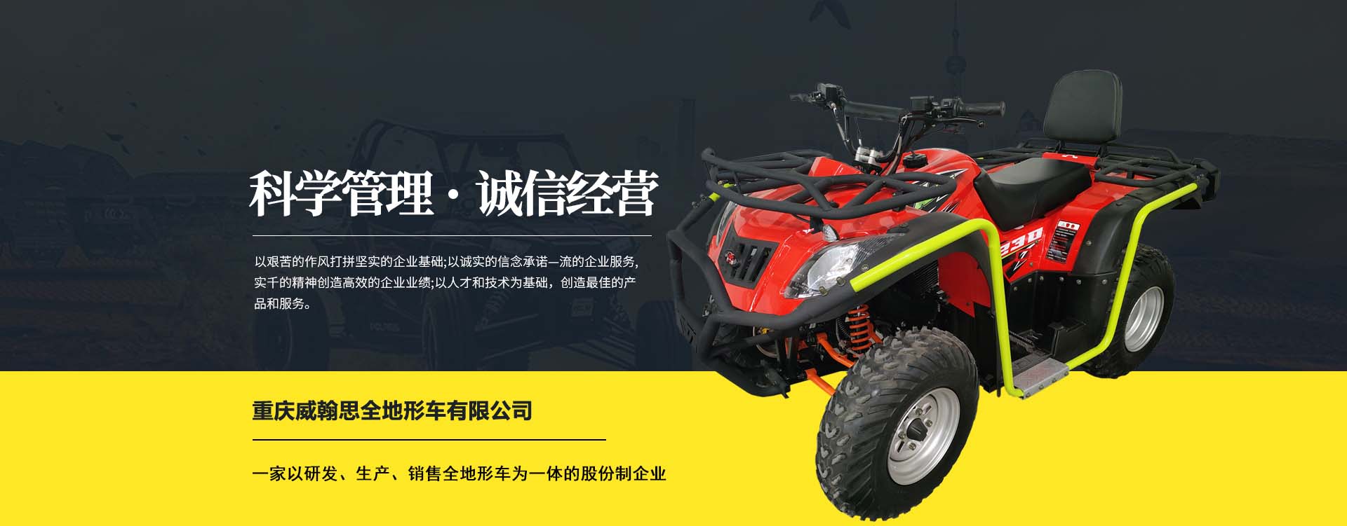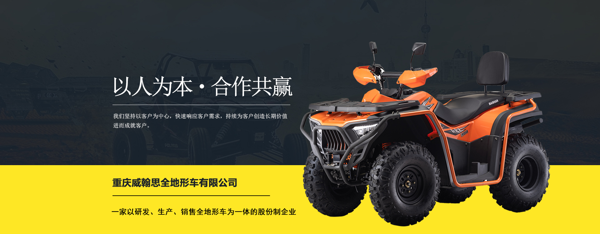 重慶威翰思全地形車(chē)有限公司成立于2016年9月,一家以研發(fā)、生產(chǎn)、銷(xiāo)售全地形車(chē)為一體的股份制企業(yè)。公司銷(xiāo)售額超過(guò)5000萬(wàn)。現(xiàn)有專(zhuān)業(yè)市場(chǎng)售后服務(wù)團(tuán)隊(duì)。公司秉承“敬業(yè)、超越、活力、用戶(hù)至上”的企業(yè)精神,“以人為本,合作共贏;”的核心價(jià)值觀,“嚴(yán)格管理創(chuàng)優(yōu)質(zhì)、名牌戰(zhàn)略拓市場(chǎng)”的質(zhì)量方針,使公司一步步邁上新的臺(tái)階。公司與重慶航天巴山摩托車(chē)制造公司達(dá)成戰(zhàn)略合作協(xié)議。共同出資致力于沙灘車(chē)旅游市場(chǎng)產(chǎn)品研發(fā),項(xiàng)自運(yùn)營(yíng)指導(dǎo),市場(chǎng)維護(hù)等全方位市場(chǎng)拓展。重慶航天巴山摩托車(chē)制造公司授權(quán);重慶威翰思全地形車(chē)有限公司為中國(guó)區(qū)唯─戰(zhàn)略合作伙伴。