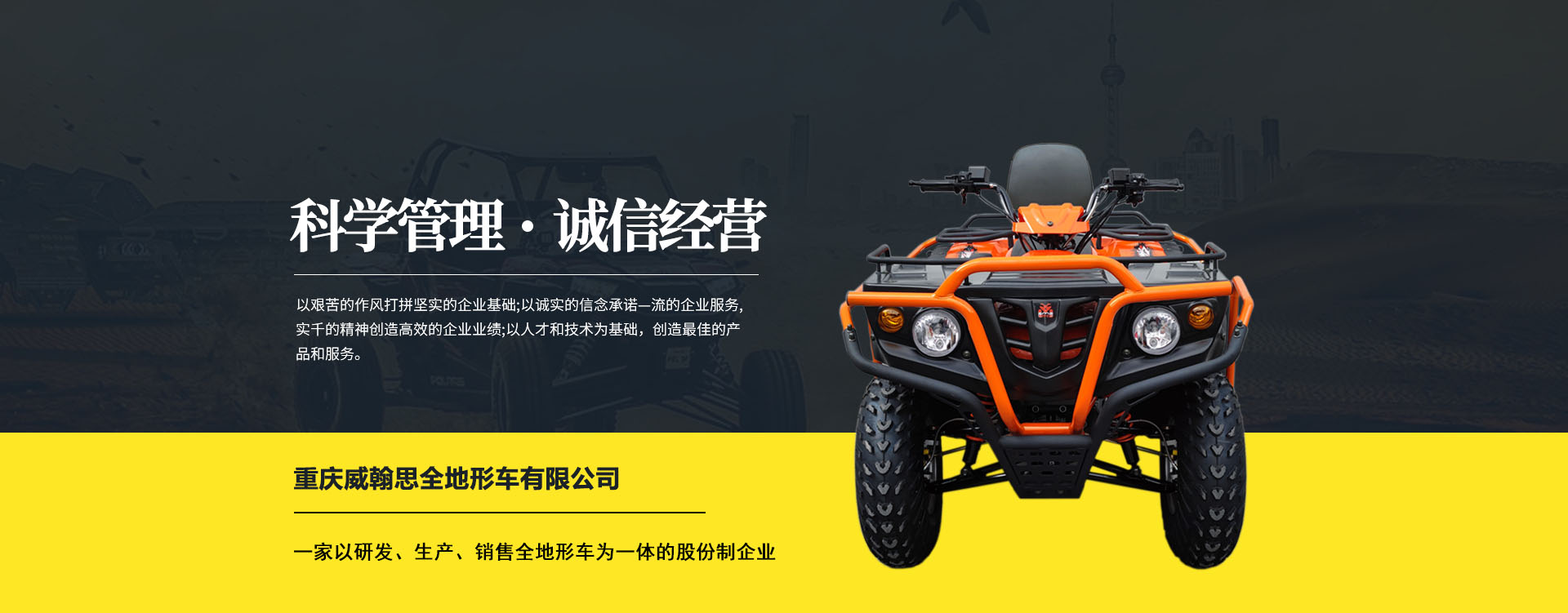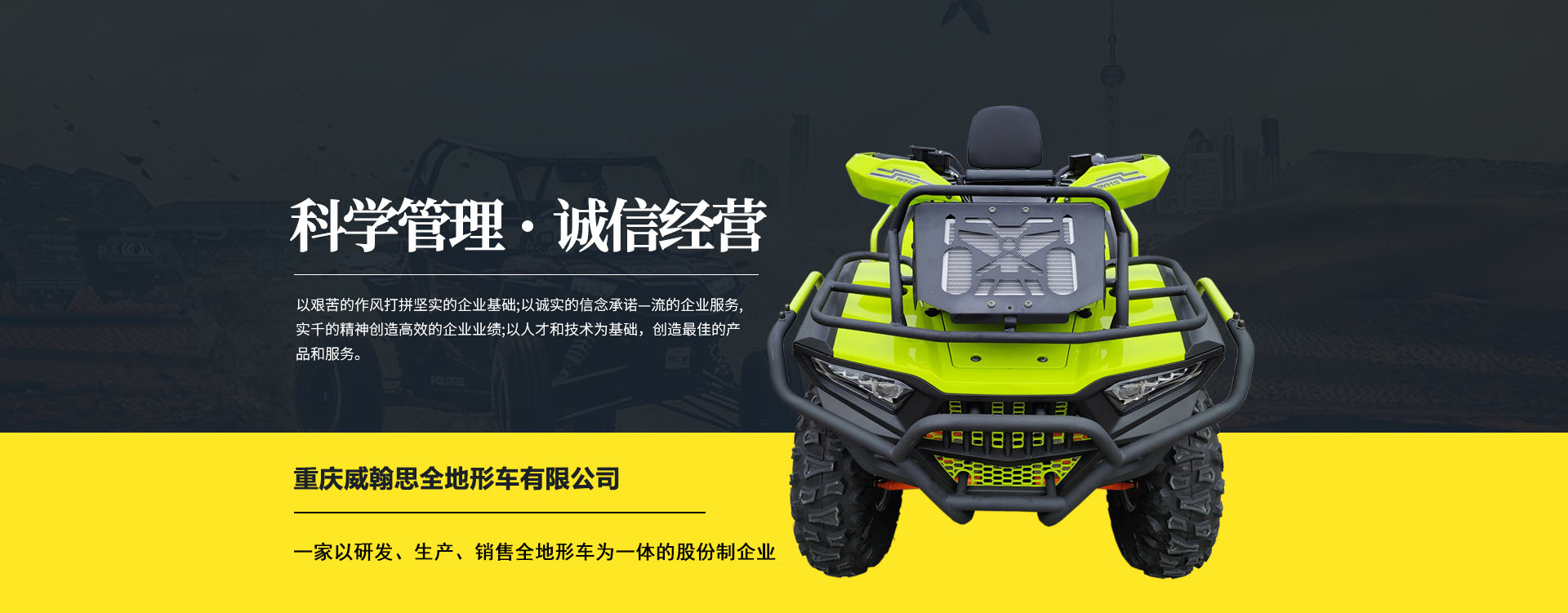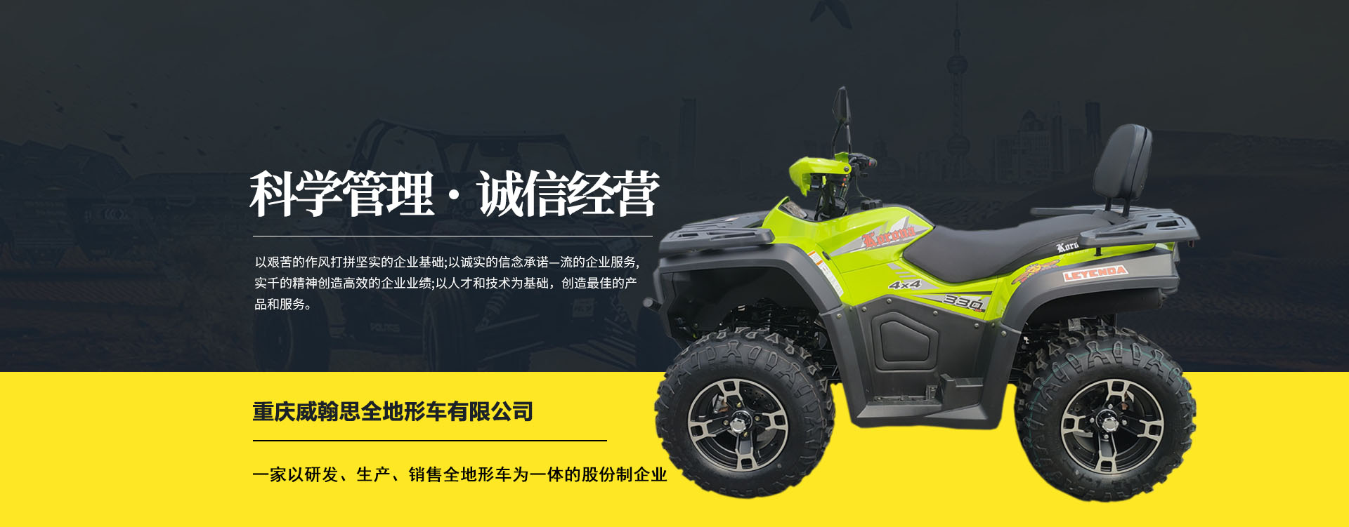 重慶威翰思全地形車(chē)有限公司成立于2016年9月,一家以研發(fā)、生產(chǎn)、銷(xiāo)售全地形車(chē)為一體的股份制企業(yè)。公司銷(xiāo)售額超過(guò)5000萬(wàn)。現(xiàn)有專(zhuān)業(yè)市場(chǎng)售后服務(wù)團(tuán)隊(duì)。公司秉承“敬業(yè)、超越、活力、用戶(hù)至上”的企業(yè)精神,“以人為本,合作共贏;”的核心價(jià)值觀,“嚴(yán)格管理創(chuàng)優(yōu)質(zhì)、名牌戰(zhàn)略拓市場(chǎng)”的質(zhì)量方針,使公司一步步邁上新的臺(tái)階。公司與重慶航天巴山摩托車(chē)制造公司達(dá)成戰(zhàn)略合作協(xié)議。共同出資致力于沙灘車(chē)旅游市場(chǎng)產(chǎn)品研發(fā),項(xiàng)自運(yùn)營(yíng)指導(dǎo),市場(chǎng)維護(hù)等全方位市場(chǎng)拓展。重慶航天巴山摩托車(chē)制造公司授權(quán);重慶威翰思全地形車(chē)有限公司為中國(guó)區(qū)唯─戰(zhàn)略合作伙伴。